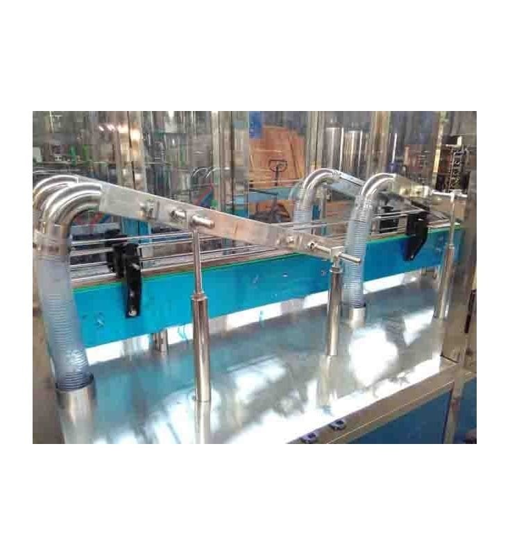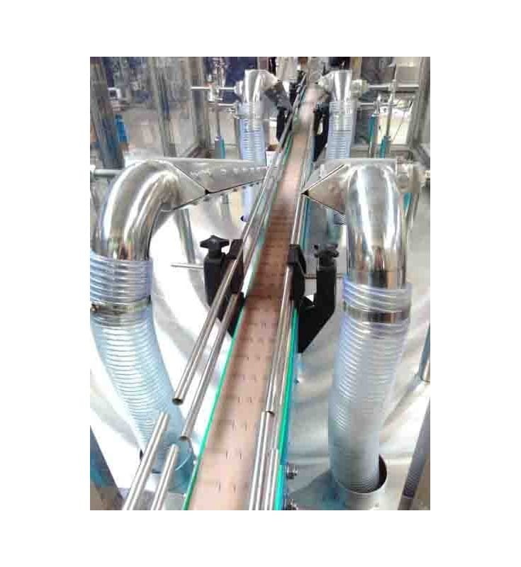 The bottles move inside the device by a conveyor belt in which two air nozzles are located.