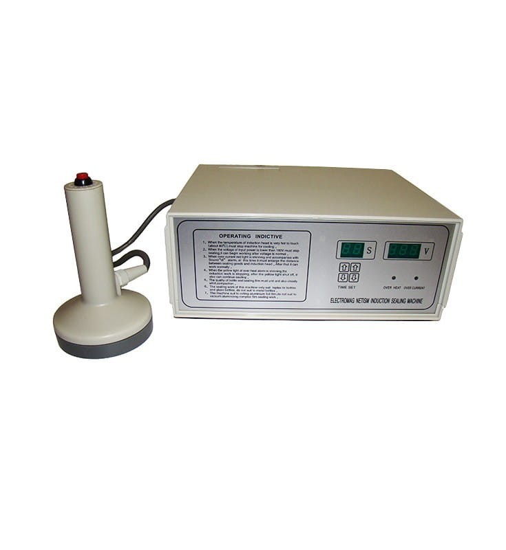 Manual welding machine designed for sticking lids under the caps of jars and bottles by means of electromagnetic induction.