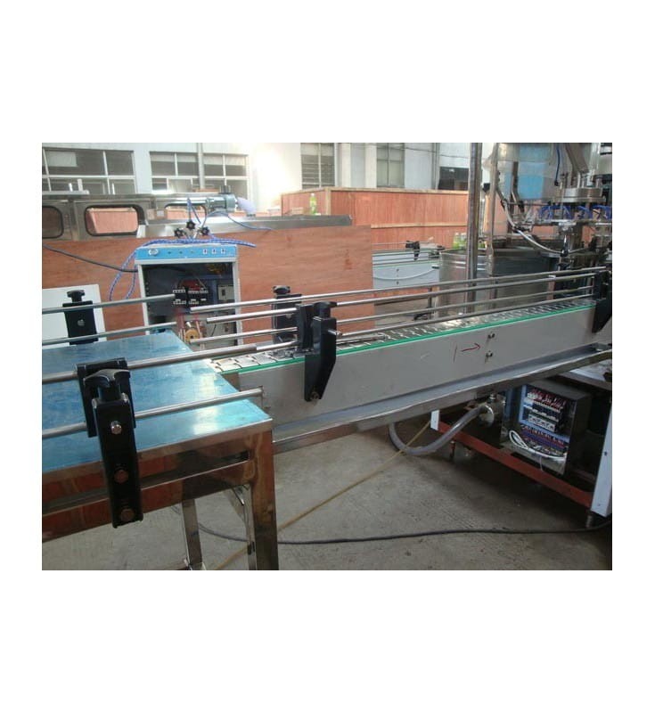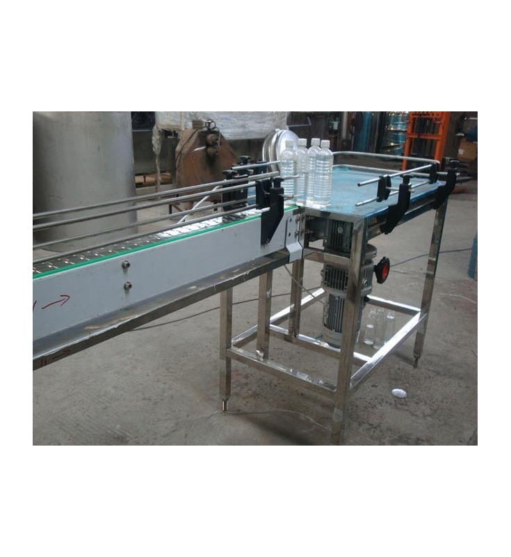 A work table designed to connect to the production line may, for example, receive bottles from the conveyor belt.