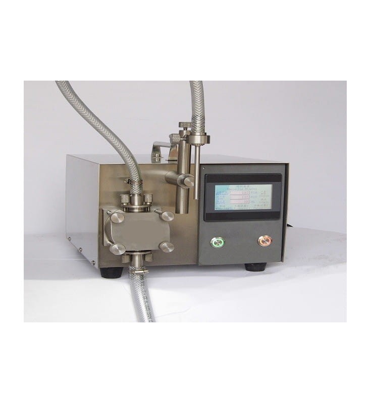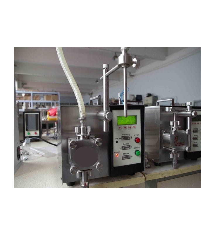 The device uses a pump system with toothed wheels for precise filling of small bottles, ampoules or small containers.