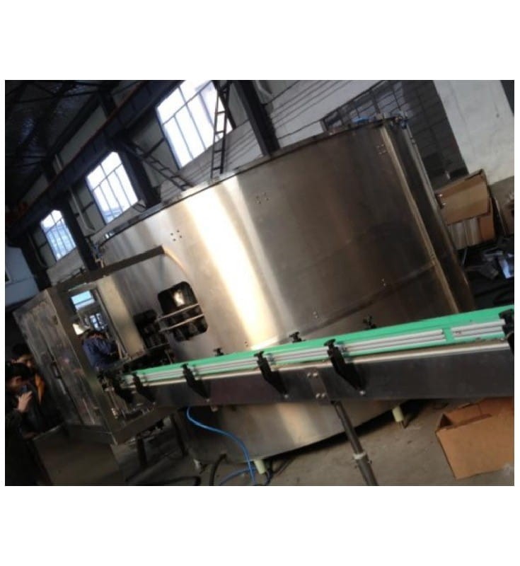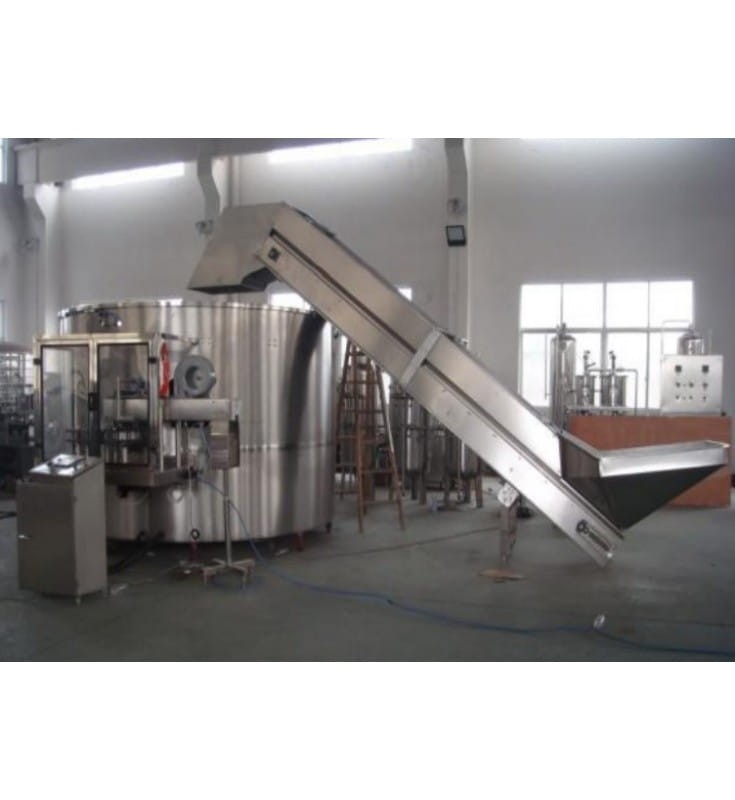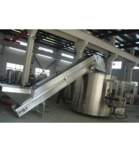 Bottle unscrambler are based on world advanced technology, designed and developed according to our country’s developing trend of high speed and automation of drink’s filling equipment. The main machine has cylinder appearance with adjustable feet at the bottom for changing machine’s height and level. In the cylinder, there is a rotating cylinder, and outside of rotating cylinder, there is the dropping bottle slot, the inner side is equipped with lifting device, which the amount is the same with dropping bottle slots. At the center of machine, there is a fixed umbrella shape tower. When the lifting device send out short of bottle message according to the bottle detecting device on the tower, bottle will drop onto umbrella shape tower from top center of the machine, then enter lifting device from the edge of tower. Under the action of cam, the lifting device pushes bottle into the bottle slot. After unscrambling in the slot, the bottle rotates along with bottle slot to the exit of unscrambler. The poking bottle star wheel at the exit will push the bottle into air convey way. The star wheel joins shaft of main motor through time geared belt.