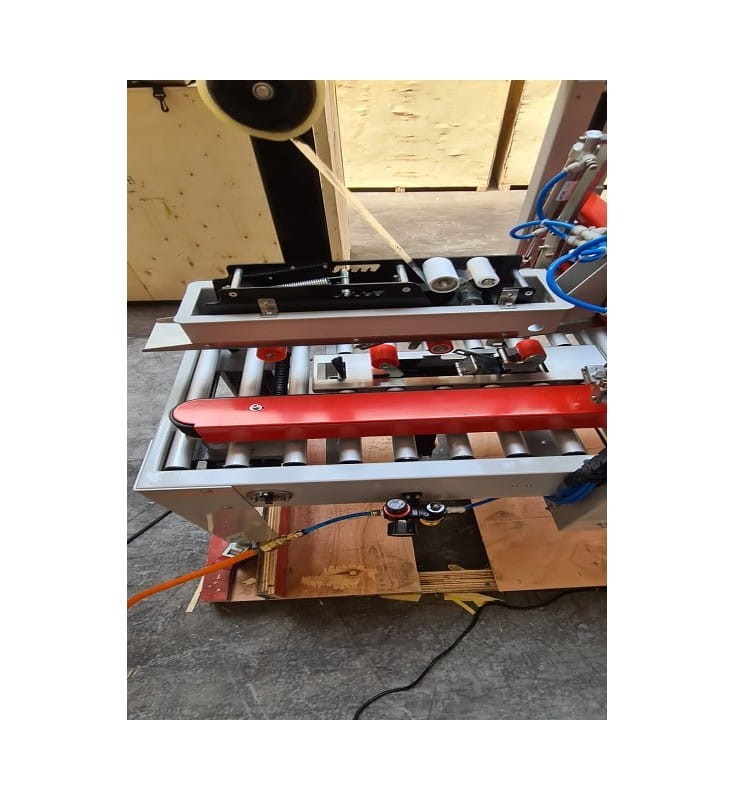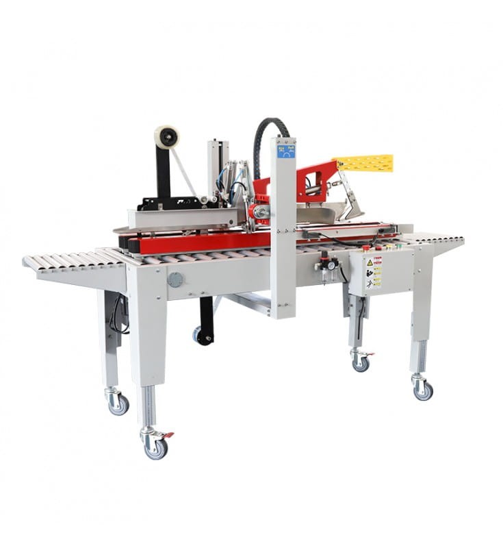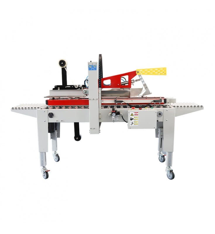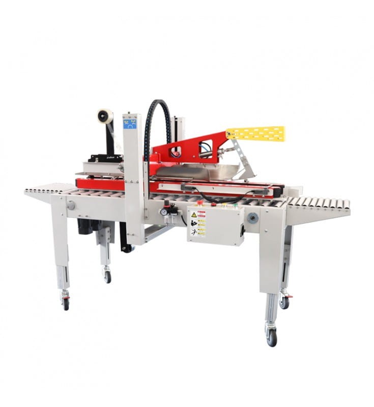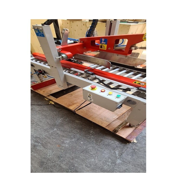Automatyczna zaklejarka do kartonów. Urządzenie zamyka górne klapy kartonu, a następnie zakleja go od góry i dołu.