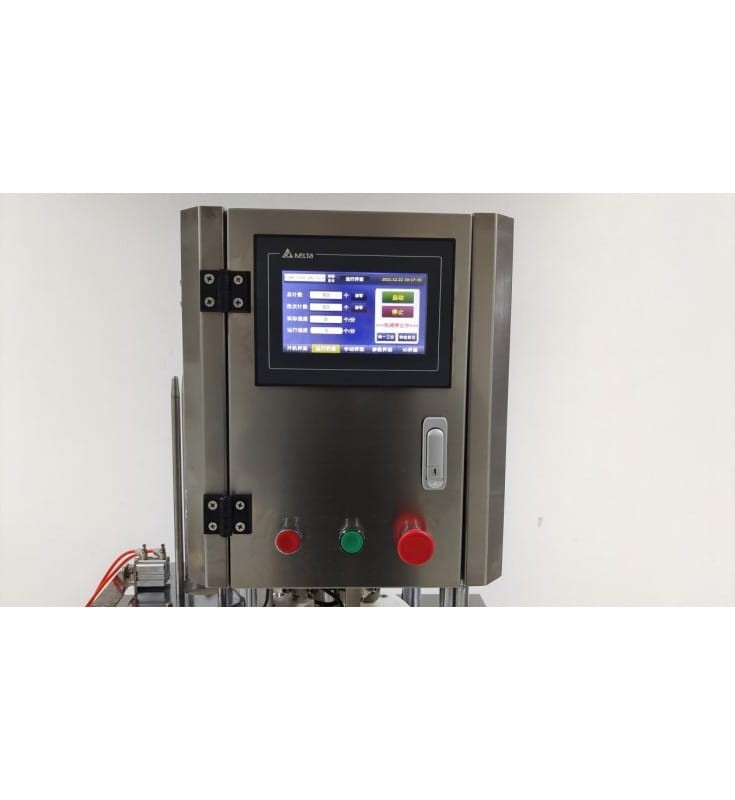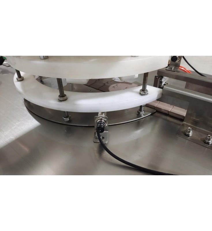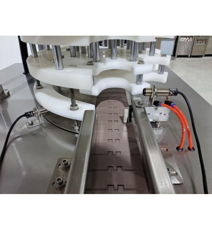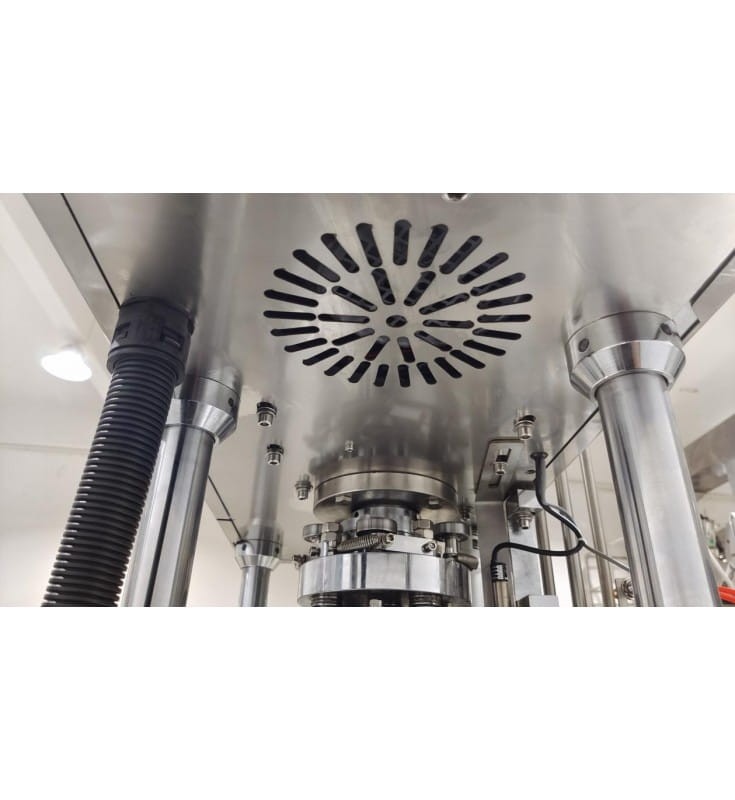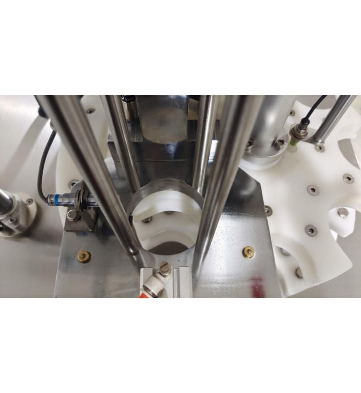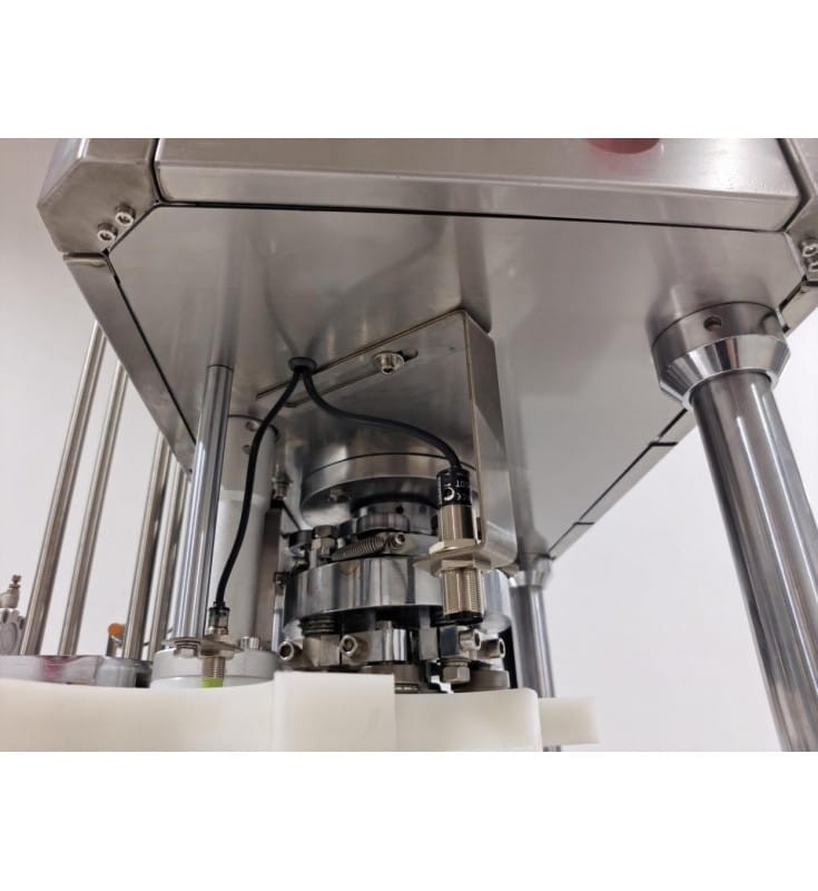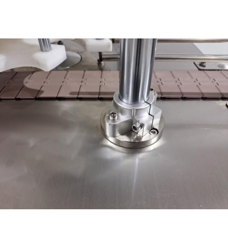 Urządzenie posiada własny taśmociąg, puszki doprowadzane są pod głowicę, tam zamykane, a następnie odprowadzane.
