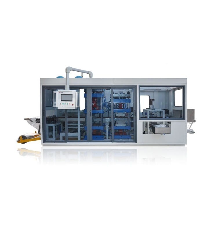 W pełni zautomatyzowana linia termoformująca przeznaczona do produkcji opakowań plastikowych takich jak np. jednorazowe talerzyki, pudełka, tacki, pokrywki do kubów itp.