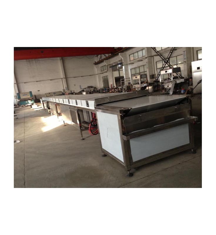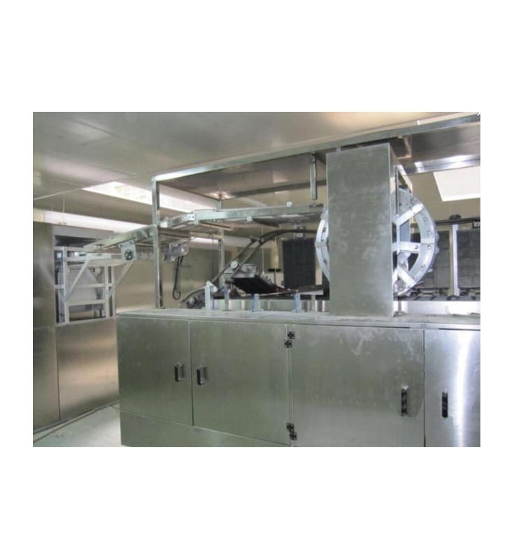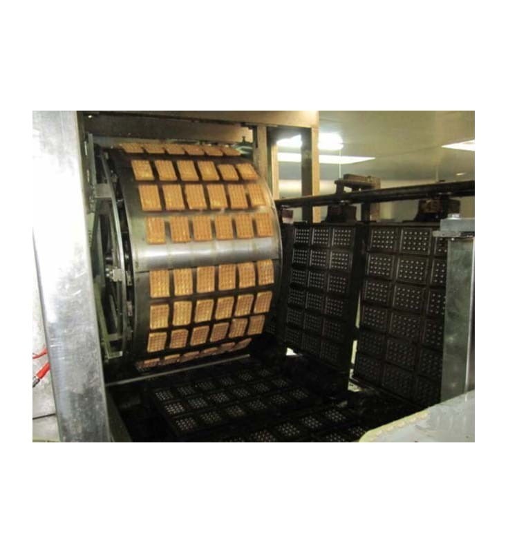 Formy po zakończeniu procesu pieczenia są automatycznie otwierane, a obrotowy bęben zbiera z nich wafle i podaje na transporter przenoszący je dalej do tunelu studzącego.