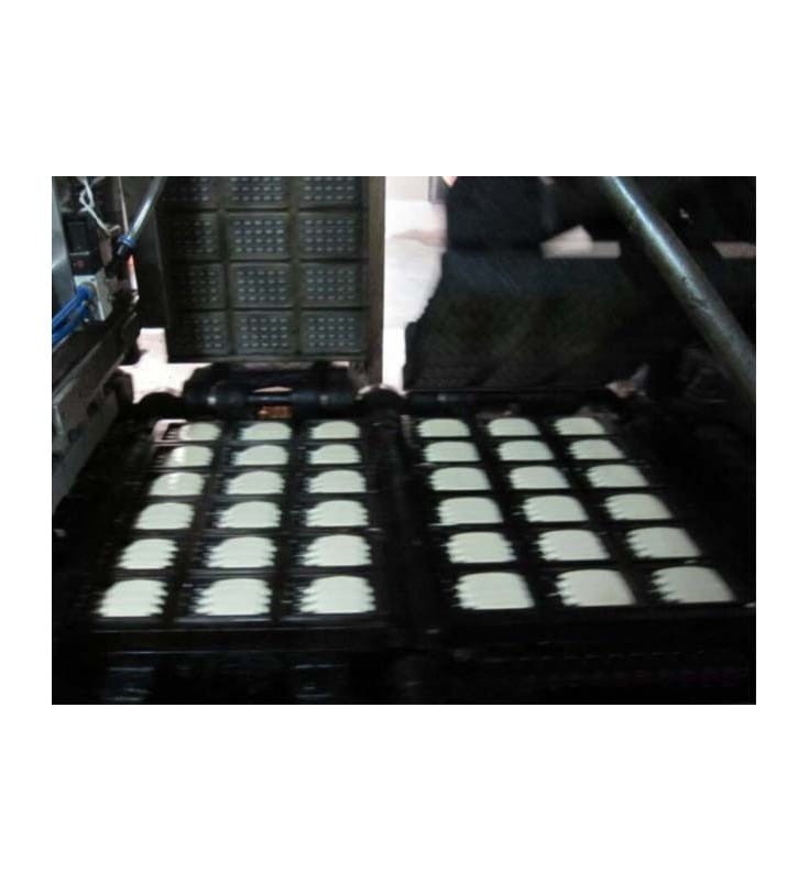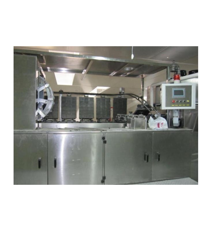Obejmuje mikser do masy, piec gazowy na 75 blach, transporter odbierający wypieczone wafle, tunel studzący i urządzenie pakujące typu flow pack.