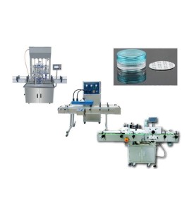 6-głowicowa nalewarka napełnia plastikowe słoiczki, które następnie transportowane są do zakręcarki z podajnikiem nakrętek.