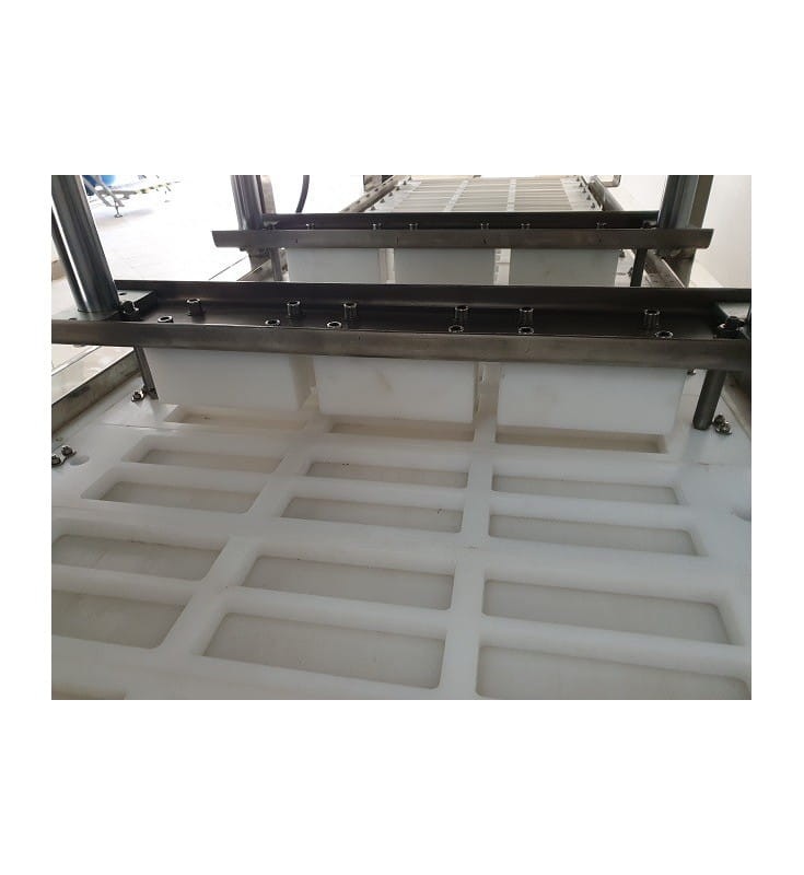 Masa w formie jest transportowana pod wentylatorami chłodzącymi, by produkt stwardniał, a następnie gotowa kula lub prostokąt zostaje upuszczony na taśmę transportową gdzie jest chłodzony i transportowany w celu zakończenia procesu produkcji.