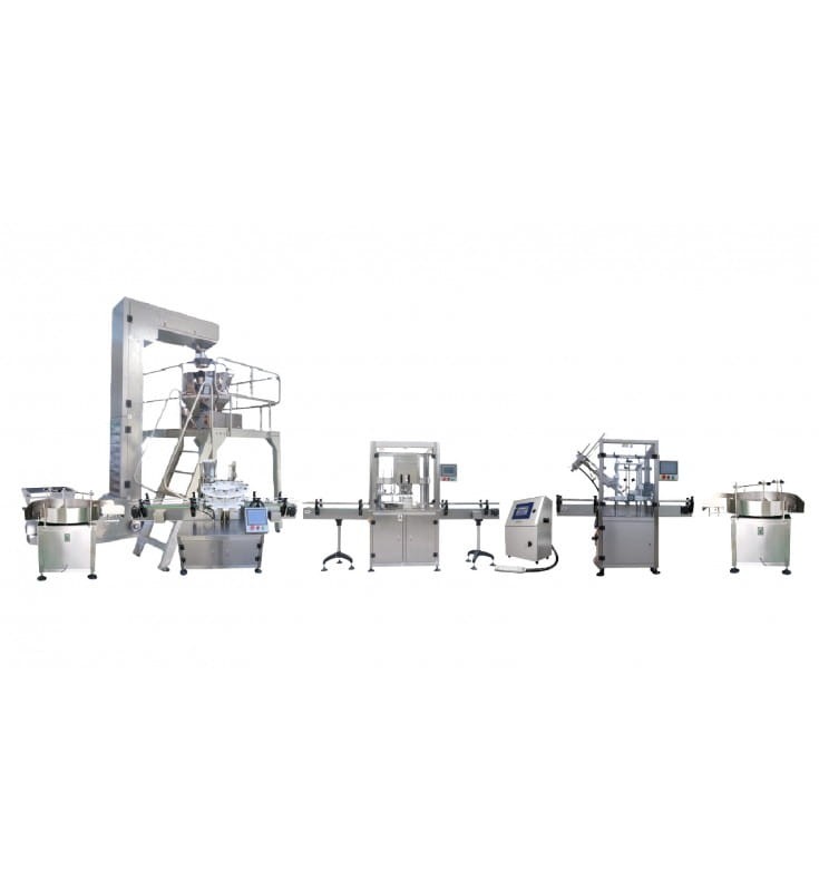 Linia do ilościowego ważenia, napełniania oraz zamykania okrągłych puszek, z produktem takim jak nasiona, orzeszki ziemne, cukierki, orzechy pistacjowe, orzechy.
