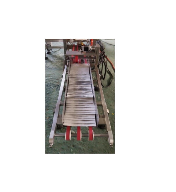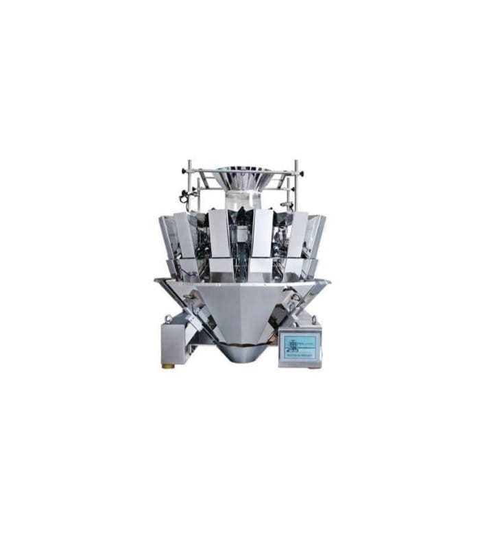 Zestaw składa się z podajnika, naważarki wielogłowicowej, maszyny pakującej i taśmociągu odprowadzającego.