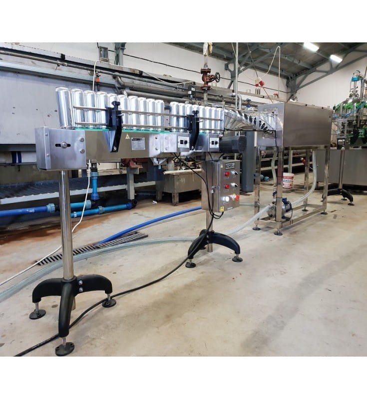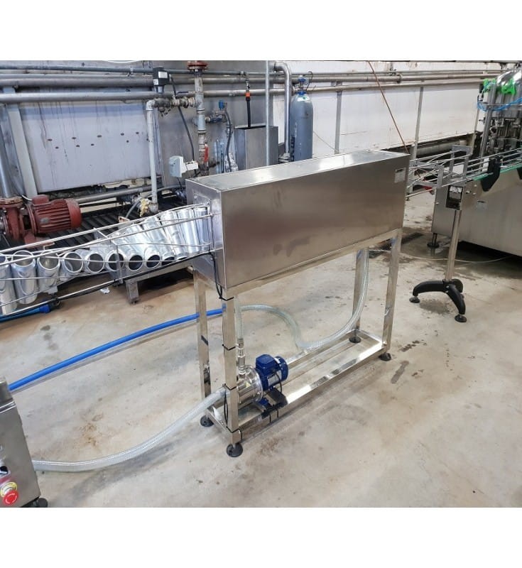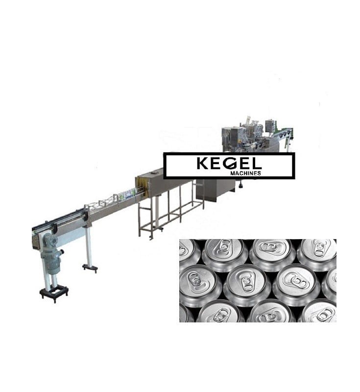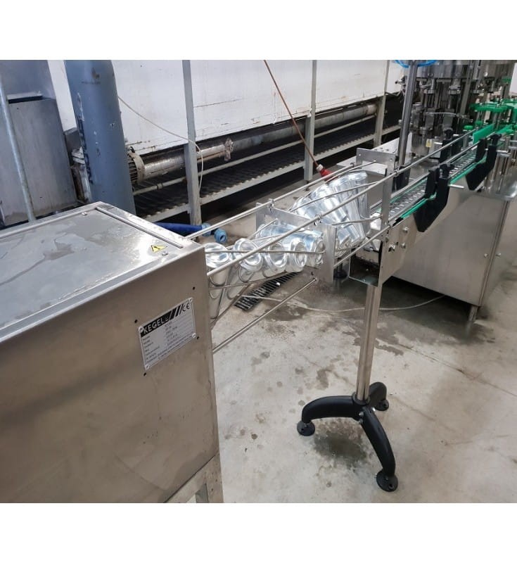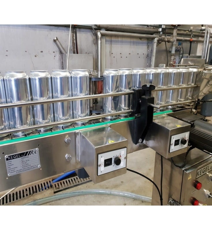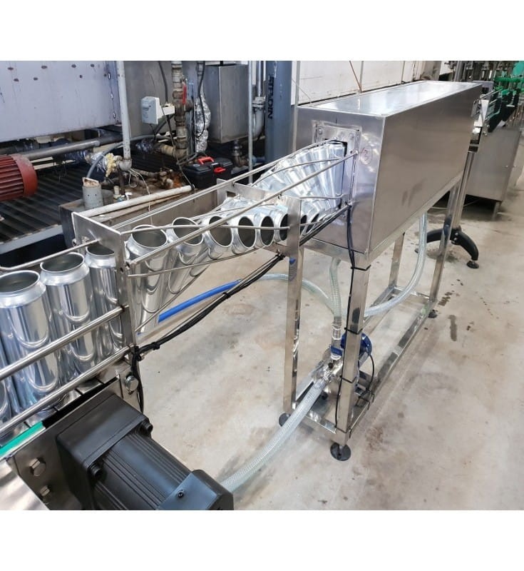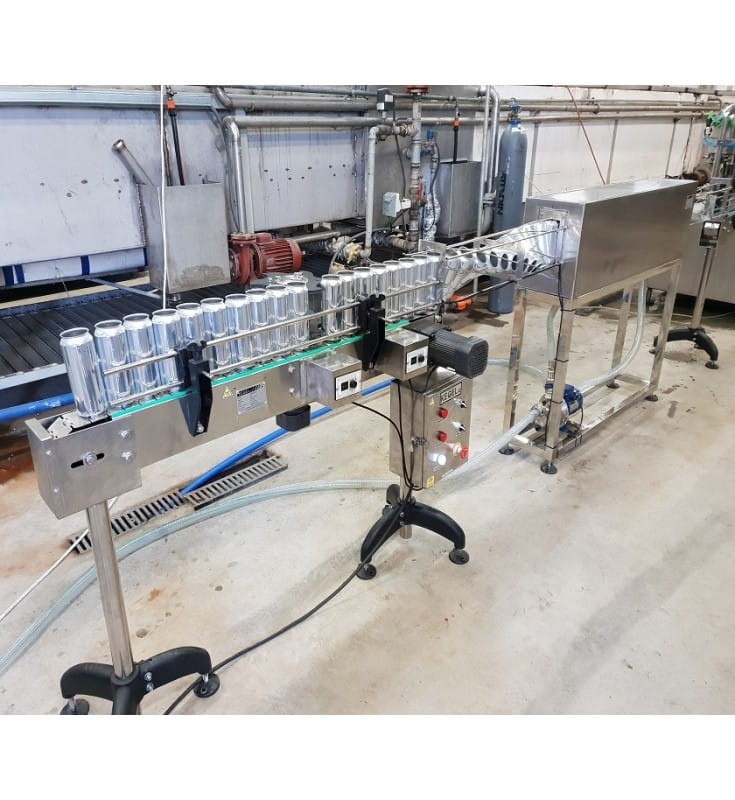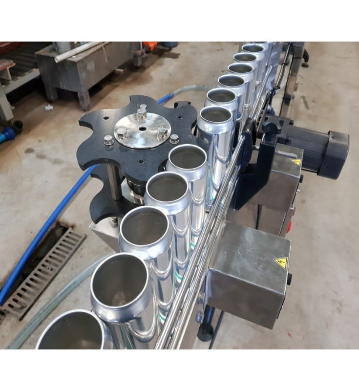 The line includes a washer, a dispenser with nozzles adapted to carbonated liquids, a can sealer, a labeling machine and a conveyor belt with an engine.
