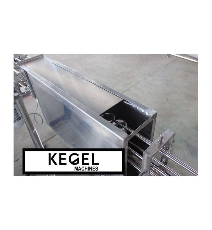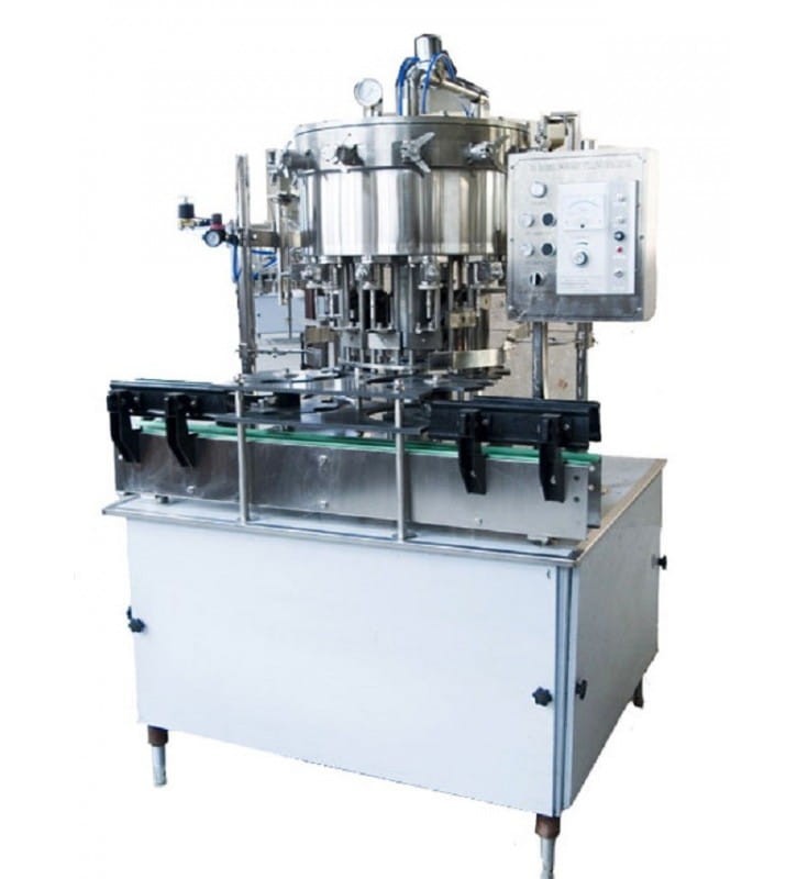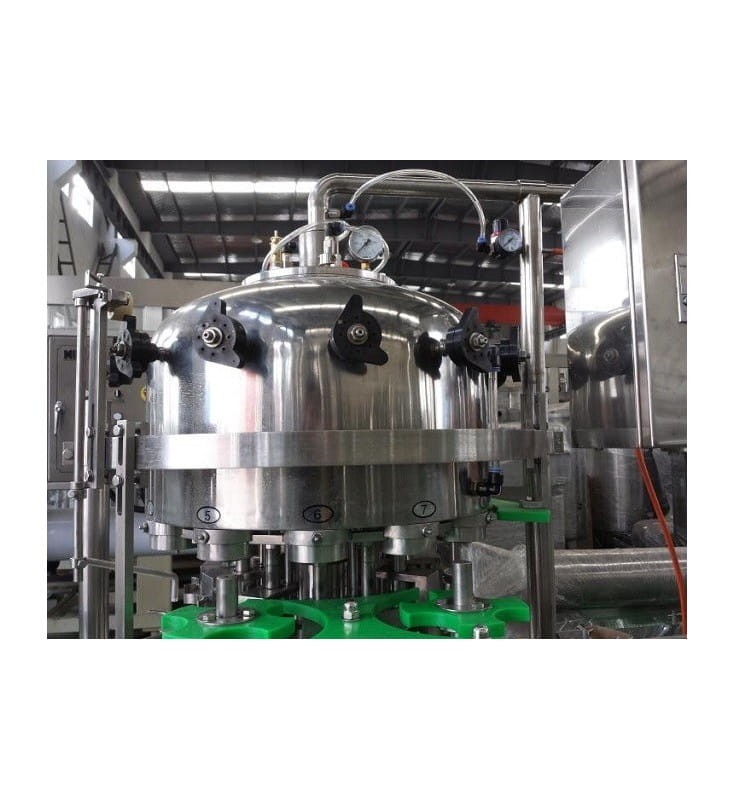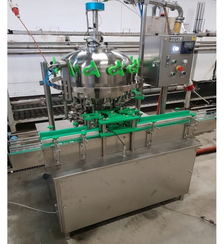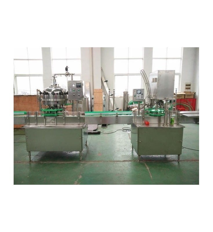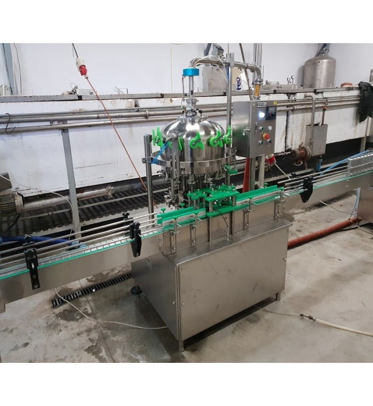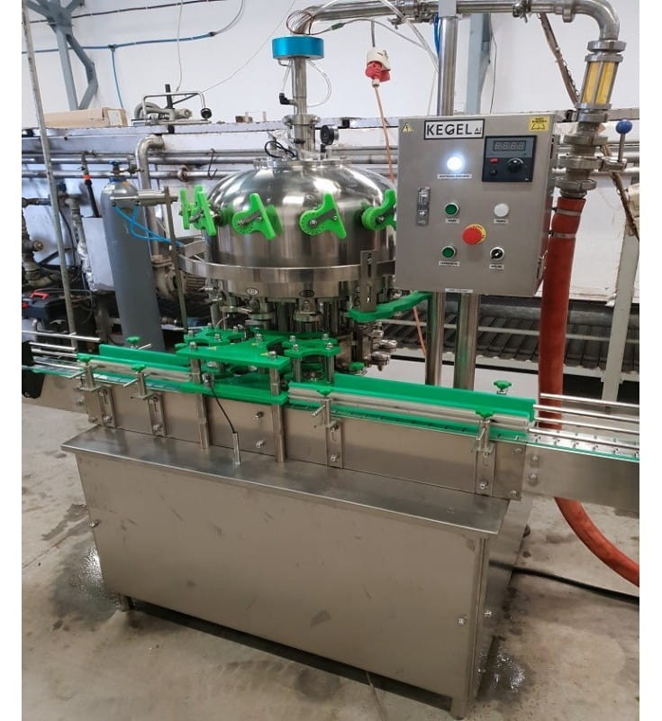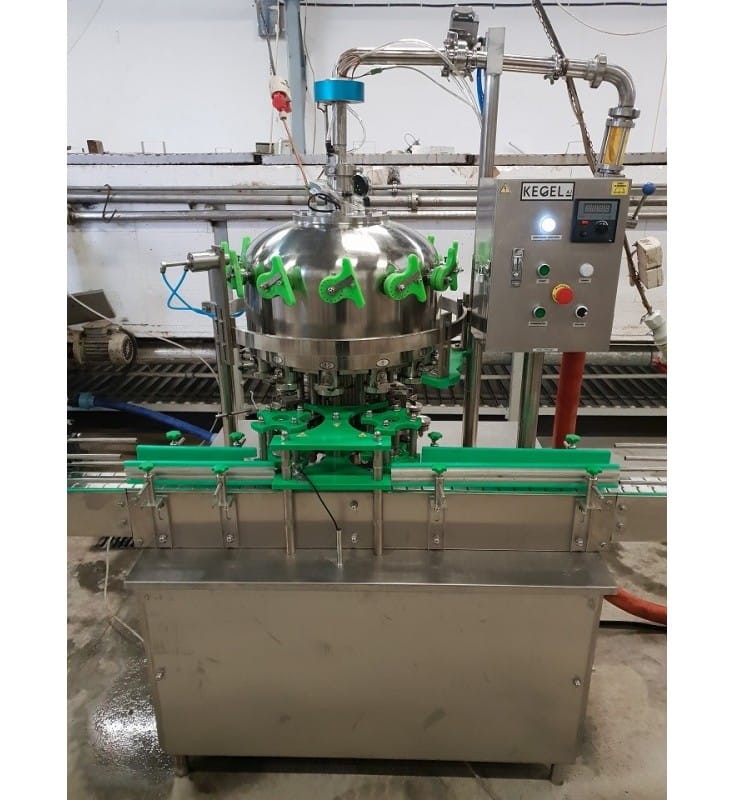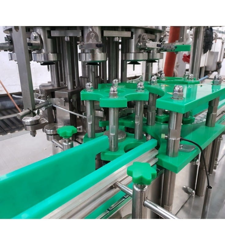The line includes a washer, a dispenser with nozzles adapted to carbonated liquids, a can sealer, a labeling machine and a conveyor belt with an engine.