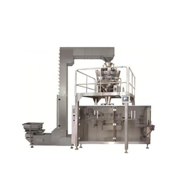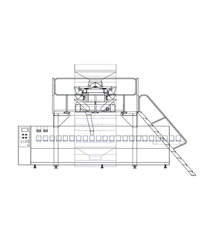 Automatic line for packing products in the form of thick granules, such as coffee beans or groats in ready-made doypack bags - paper. Line adapted for stringed closure bags. The line includes a 10-head balancer, a pneumatic dispensing machine and a closing bag, an elevator delivering the product to the hopper, a conveyor belt that receives the finished product and a platform. The machine opens, fills and closes each bag. Complete on reliable components of the production. French and Japanese. Easy to use and trouble-free.