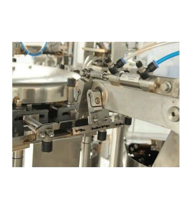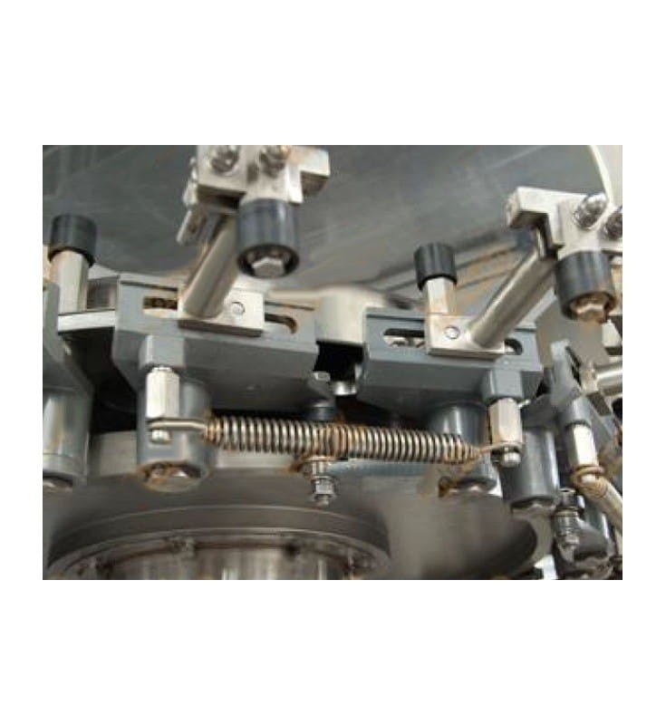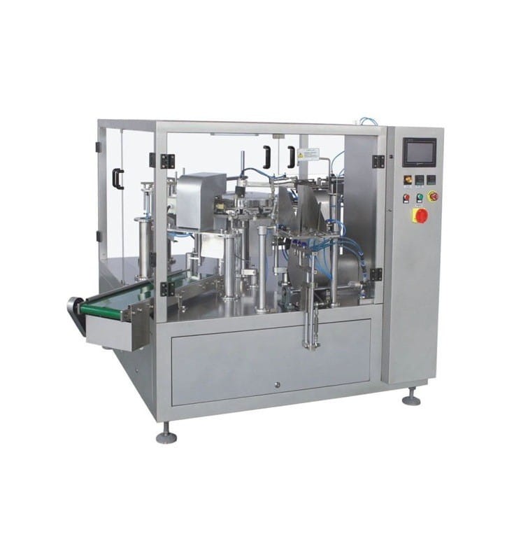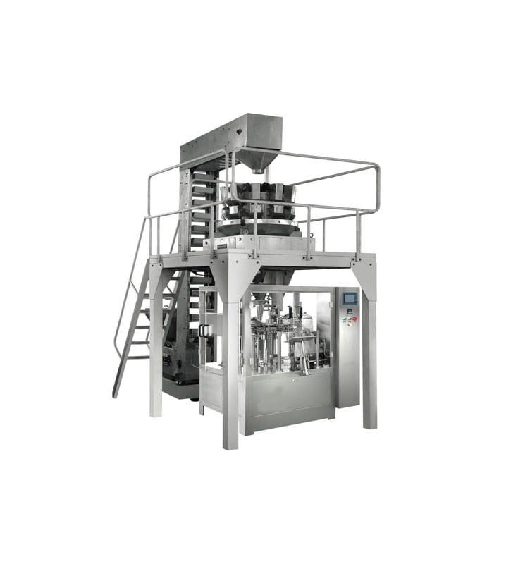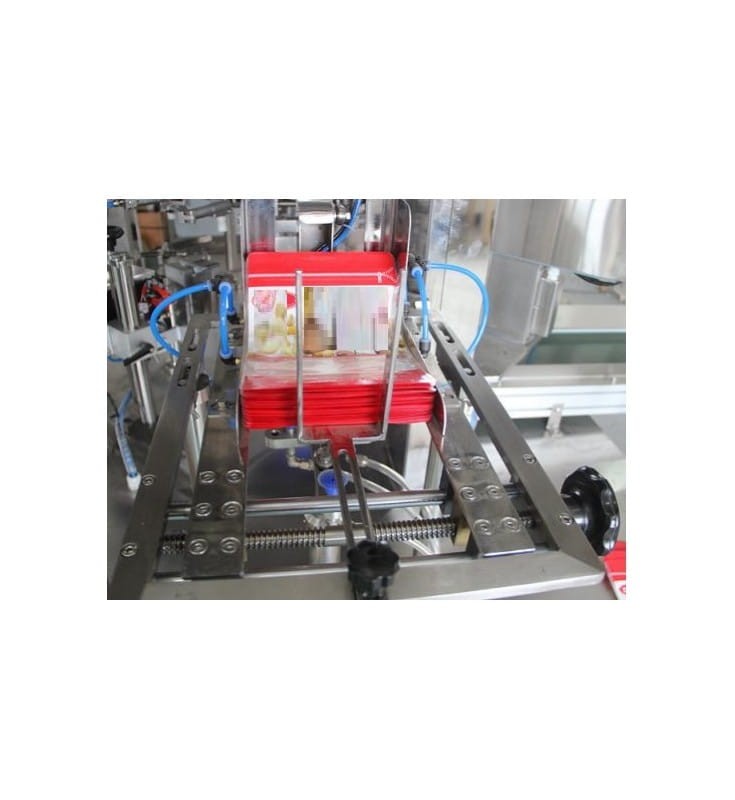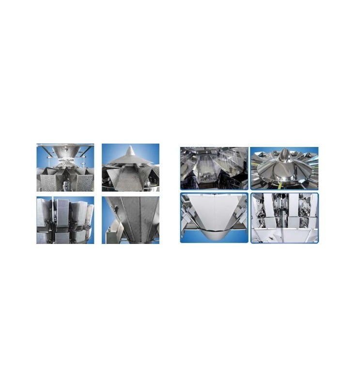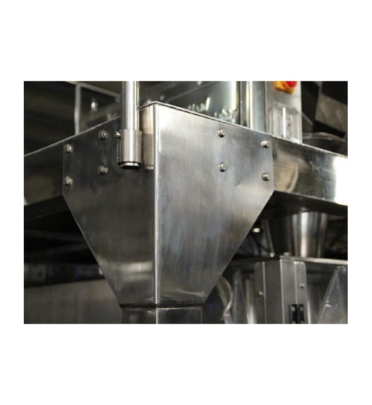 Fully automatic line designed for filling ready-made doypack bags with granules (and other solid products), and closing them. It is suitable for products of various sizes, eg pasta, sweets, biscuits, dried fruits, coffee beans, dry food for animals and others. The product is fed with a "Z" type elevator to a 10-head balancer, where it is portioned and passed to the packaging machine. The packaging machine has 8 stations where each bag is opened, filled and closed and then discharged by an external conveyor. The last element of the line is a platform for controlling the packaging process and maintaining the balancers. Easy-to-use touch screens, solid construction, high quality components. Operational stability is guaranteed by PLCs. The packaging machine is equipped with a bag detection system - when there is no bag or bag in the packing station it is not open enough to dispense. This allows you to minimize losses. Devices made of stainless steel.