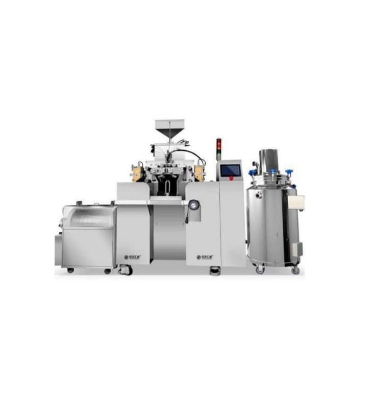 It consists of: heated gelatin melting tank, dryer, compressor, extrusion molds, water cooling machine.
