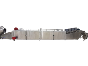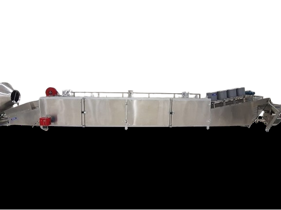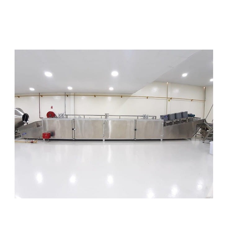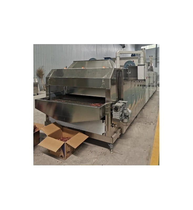 Maszyna do prażenia orzechów tunelowa. Gorące powietrze wnika w produkt od dolnej części przenośnika siatkowego w górę, a następnie uzupełnia energię cieplną poprzez element grzejny. Regulowana prędkość przenośnika taśmowego i odpowiednio ustawiona temperatura zapewniają równomierne prażenie orzechów.