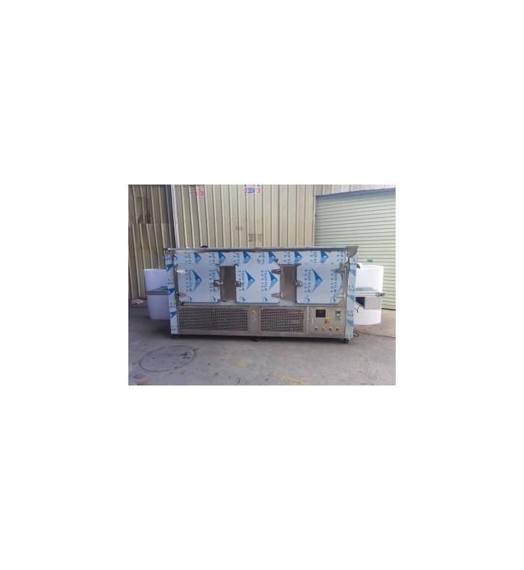 Tunel chłodzący przystosowany do ochładzania pojemników z ciepłym produktem nalanym do butelek.