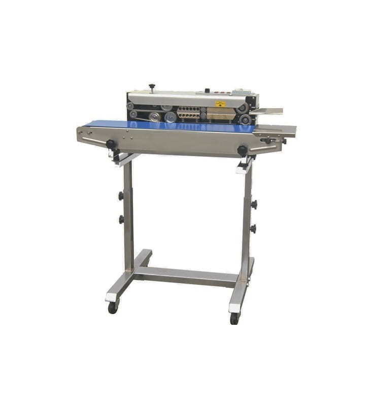 Stałocieplna zgrzewarka taśmowa do zgrzewania woreczków w pozycji poziomej.