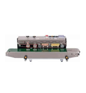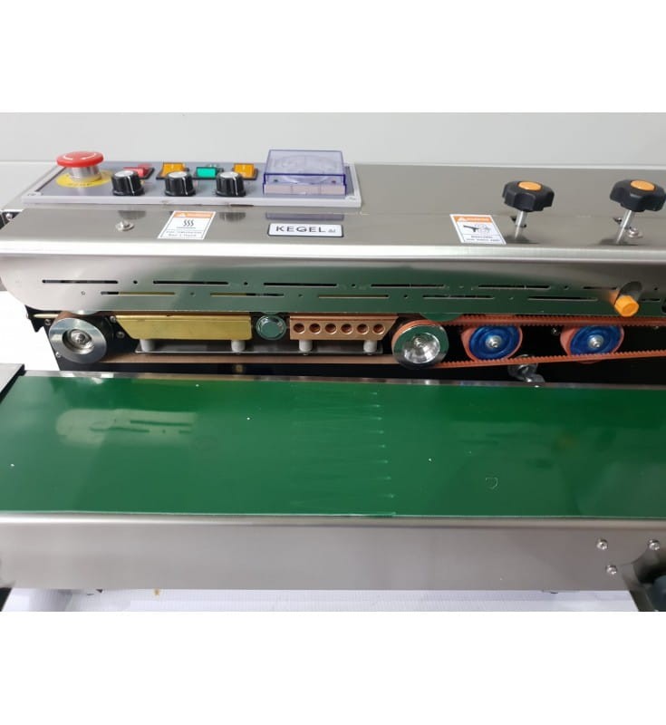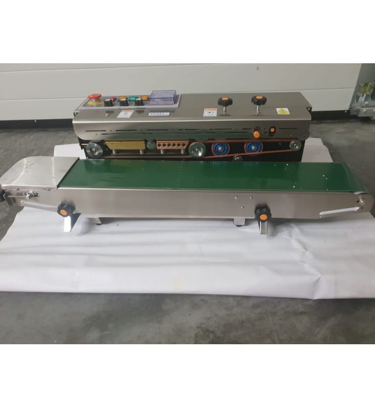 Stałocieplna zgrzewarka z taśmociągiem przeznaczona do zgrzewania woreczków w pozycji poziomej.